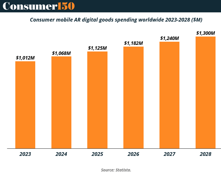 Spending on mobile AR digital goods is rising steadily—but not explosively. According to Statista, global consumer spend will climb from $1.01B in 2023 to $1.3B by 2028, marking a 28% growth over five years. That’s a CAGR of just over 5%, notable but not meteoric for a tech segment often hyped as “next-gen.”