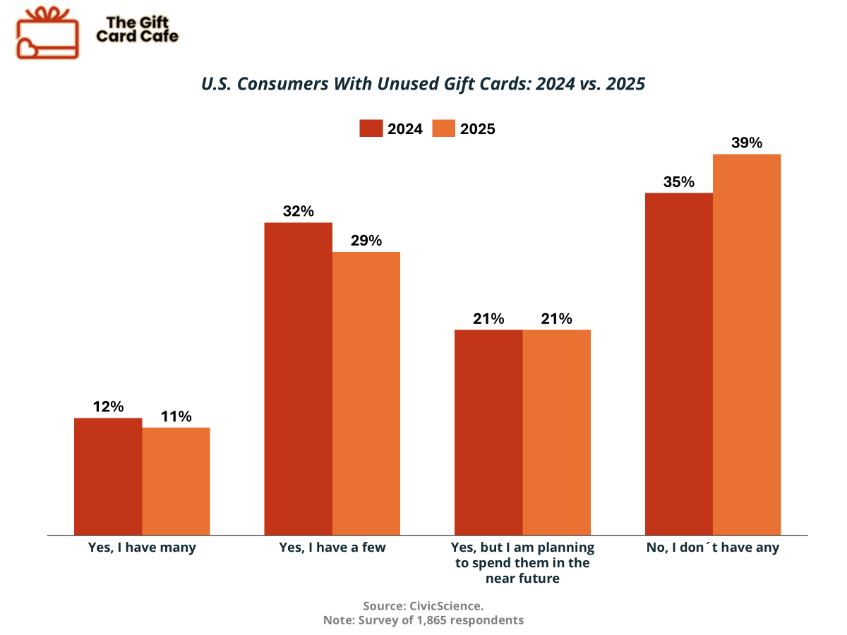 Gift cards are finally leaving wallets—and not just for birthday emergencies. In 2025, 39% of Americans reported no unused gift cards, up from 35% in 2024. Meanwhile, the share of those sitting on just “a few” cards dipped from 32% to 29%. Translation: consumers are either spending quicker or stockpiling less. Yes, 11% still hoard “many” cards, but the broader shift suggests rising awareness and maybe a Marie Kondo moment for retail credit. If you’re a brand, the takeaway is simple: breakage is down, redemption is up—plan your margin math accordingly. (More)