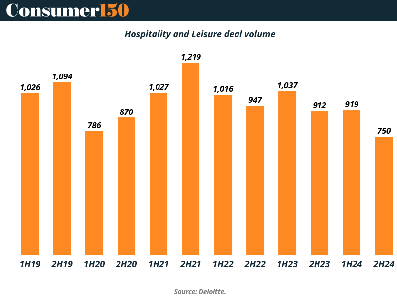 After a post-pandemic high, M&A in hospitality and leisure is running low on fuel. According to Deloitte, deal volume in 2H24 dropped to 750, the lowest since early 2020. That’s down 18.4% from 2H23 and a sharp 38% drop from the sector’s 2H21 peak of 1,219 deals.