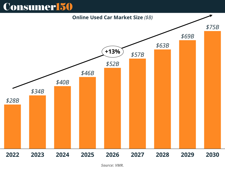 The online used-car market isn’t just accelerating — it’s rewriting the rules of the road. Sales are growing at a 13% compound annual rate, expected to hit $75B by 2030. Once plagued by the "lemons" problem, transparency tools like vehicle history reports and price comparison platforms now let buyers avoid costly surprises. 95% of used-car searches begin online, with 70% leveraging third-party marketplaces. This has forced price convergence and turbocharged dealer profits — McKinsey pegs a $22B market uplift across North America and Europe.