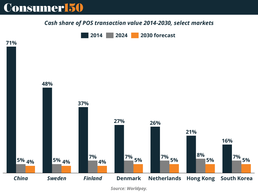 Sweden and Finland — early adopters of digital payments — now see cash accounting for under 5% of all POS transactions.