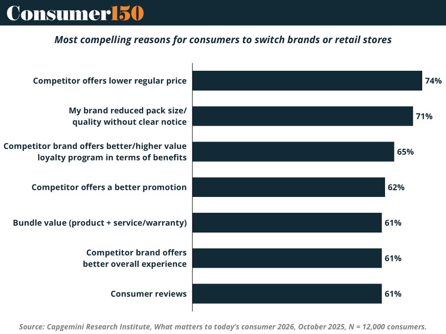 Consumer loyalty is getting audited—and most brands are failing the value integrity test. Yes, price still matters: 74% of consumers will switch for a lower regular price, not a flashy promo. But the bigger red flag? Trust erosion. A striking 71% walk when brands quietly shrink pack sizes or downgrade quality. That’s shrinkflation crossing from margin management into reputational risk.