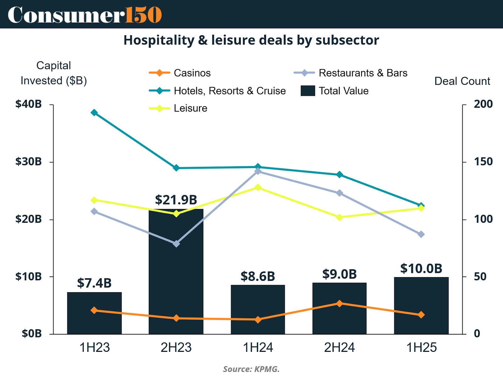 Here, Hotels, Resorts & Cruises continue to dominate deal value, maintaining near-constant levels around the $30 billion mark, while Casinos and Restaurants & Bars demonstrate more subdued investment profiles. Interestingly, the Leisure segment (which includes experiential travel, outdoor recreation, and wellness tourism) has held steady in deal activity even amid macro volatility, signaling investor confidence in lifestyle-oriented experiences.