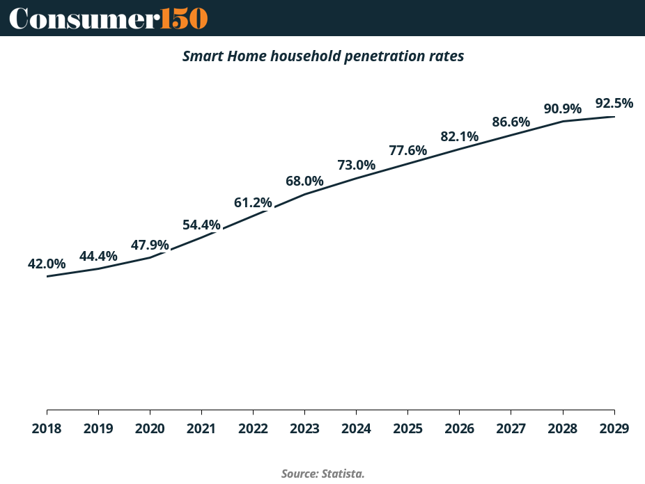 Meanwhile, household penetration rates for smart home devices are rising fast, growing steadily from 2018 and projected to continue climbing through 2029. This underscores a long-term shift in how people live—and who gets to power that experience.