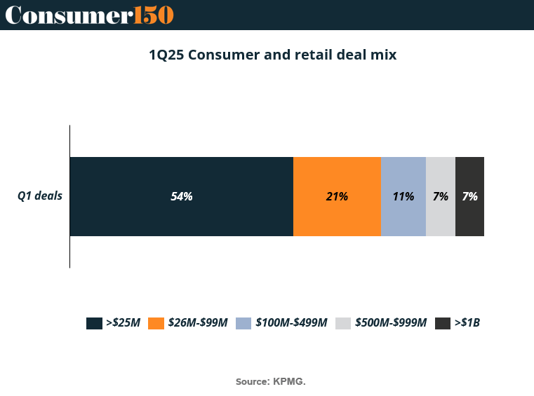 The 1Q25 consumer and retail deal mix signals a clear trend: smaller is stronger. According to KPMG, 54% of all deals came in under $25M, while deals over $500M made up just 14% of activity. Mega-deals aren’t dead, but they’re taking a back seat to bolt-ons, tuck-ins, and strategic early-stage bets.