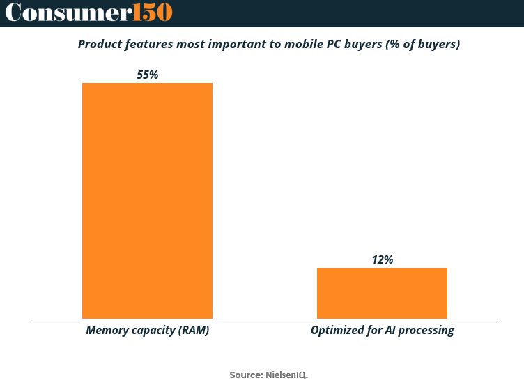 Despite the industry’s full-court press on AI-enabled laptops, buyers are signaling they still care more about the basics. According to NielsenIQ, 55% of mobile PC buyers rank memory capacity (RAM) as their top priority, while just 12% consider AI optimization important.