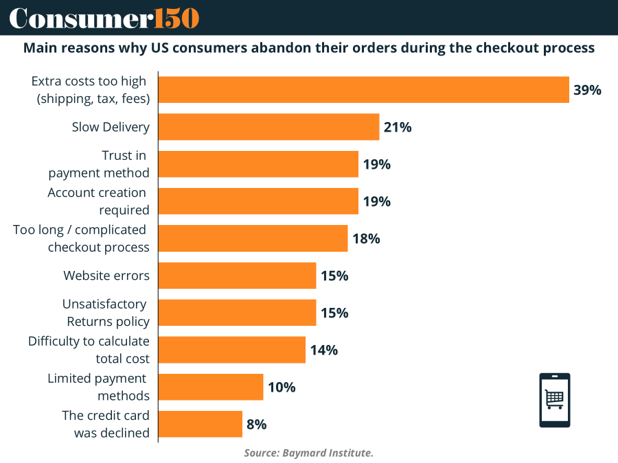Nearly 70% of shopping carts are abandoned, and it’s not because consumers are indecisive—it’s because they're price sensitive and impatient. Top of the list? Extra costs like shipping and tax, which drive away 39% of users. This is classic elasticity behavior: even minor unexpected fees trigger a sharp drop-off in conversions. Want to avoid this? Bake the fees into your base price—what economists call price-inclusive framing.
