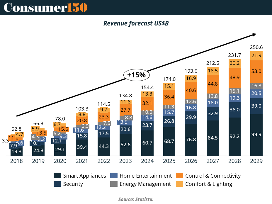 Smart home revenue is projected to hit $250.6B by 2029, growing 15% annually. But this isn’t a gadget arms race—it’s a war over who controls your living room. Amazon (30% share) leads the pack with Alexa, followed by Google (20%) and its Nest ecosystem, and Apple (6%), playing the long game with privacy-led HomeKit. The battleground? User lock-in, not new devices. Only 63% of tech sales in 2024 came from recent product launches (vs. 75% in 2021). Meanwhile, household adoption keeps rising, especially for smart appliances and security systems, which are set to double by decade’s end. The future of consumer tech isn’t about what you buy—it’s about who you’re married to. (More)