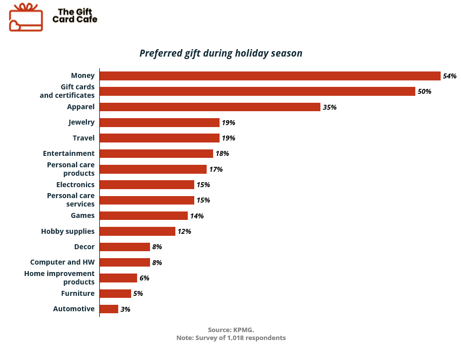 50% of consumers prefer gift cards over actual products this holiday season — putting them just behind cash (54%) and well ahead of apparel (35%), per KPMG. That’s not a fluke. It’s a shift in values: flexibility > surprise.