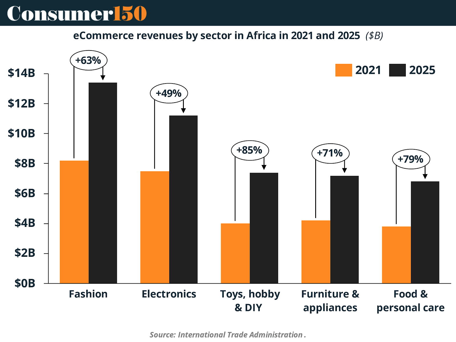 Between 2021 and 2025, all major eCommerce verticals are expected to post double-digit growth. Here’s a breakdown of sector-specific revenue projections: